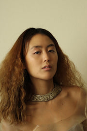 Silver, Art Deco, collar necklace. Constructed from extremely rare, 1930's, metallic handworked trim found in a miraculously well-preserved, European couture sample book. Silver-tone hardware and clasp.