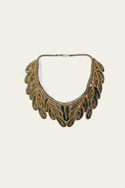 Art Deco collar necklace in gunmetal silver and yellow-gold. Constructed from extremely rare, 1930's, metallic handworked trim found in a miraculously well-preserved, European couture sample book. Affixed to a 1930's, French couture "snake" chain with a 1930's West German closure hook.