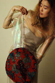 Oval tote bag made from rare, 1920's French Art Deco velvet. Backed in a pale blue moiré fabric with iridescent overlay. Iridescent ribbon handle.