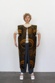 A long, tunic vest made from 1920's French, Art Deco, upholstery-weight metallic textile that would have originally been intended for some seriously chic furniture (a la Maurice Dufrene or Emile-Jacques Ruhlmann) from the period. It's not liquid-y like 20's lamés - it's still soft, but it has a lot fo body, which allows it to keep its shape. Lined in mid-century, blush crepe-backed silk made by Skinner. Completely hand finished. Has a beautiful patina that shines brightly in the sunlight.