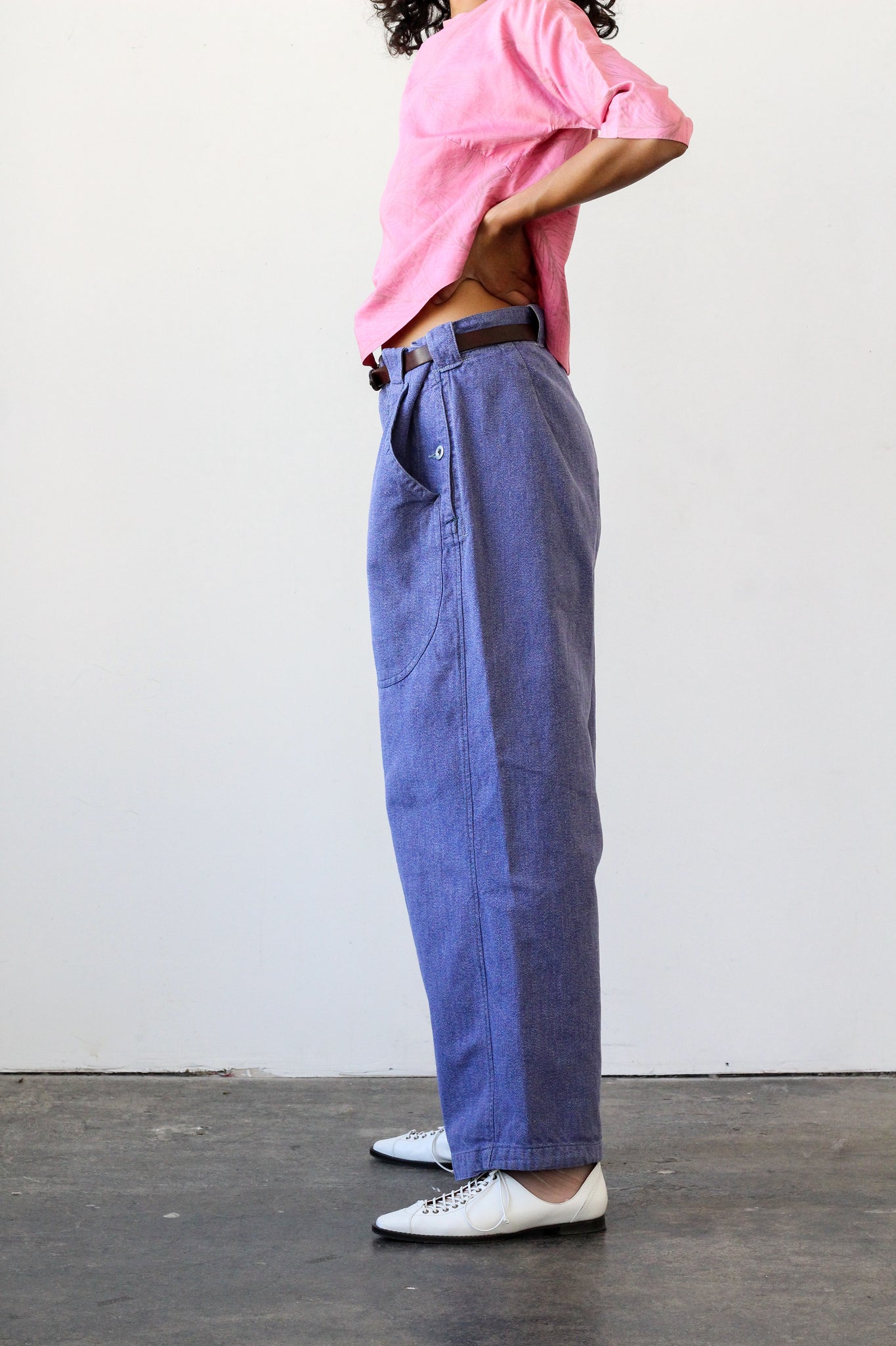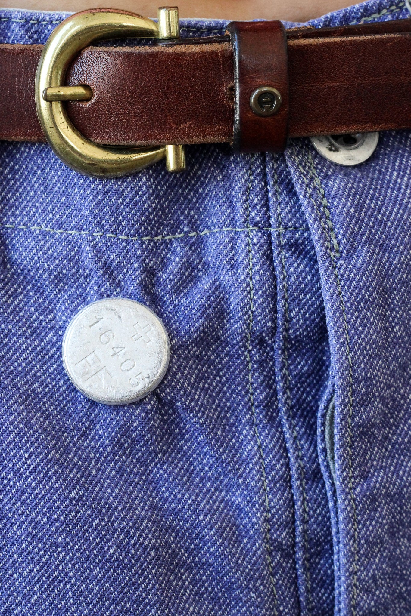 Vintage mid-century Swiss overstock prison/military-issued jeans. Periwinkle blue heavier-weight denim chambray. Metal donut buttons. Large front pocket. Suspender buttons. Button fly. Interior ID stamp + metal ID button at the front with Swiss flag.