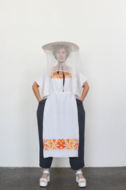 A custom piece made from an antique, mid-1910's to early 1920's previously uncut linen dress panel pre-embroidered with stunning orange and marigold Etruscan Revival or Italian Grotesque-style motifs. New drawstring ties at each side of the waist. Partial hand-finishing. Slips over the head, but has a split down the upper back with a button and loop closure. Comes with a tiny Italian lead customs seal that was originally attached to the bottom right corner of the panel.